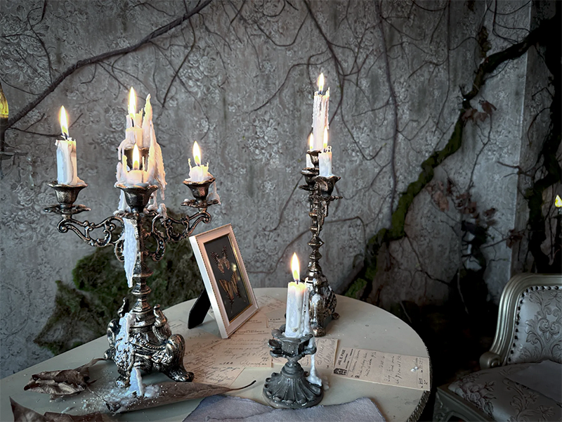 ろうそくの柔らかな光と影が織りなす空間は、まるで物語の一場面を切り取ったかのような雰囲気を生み出します。