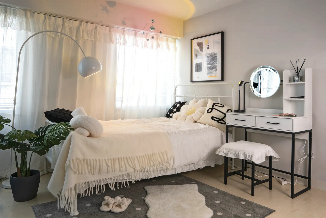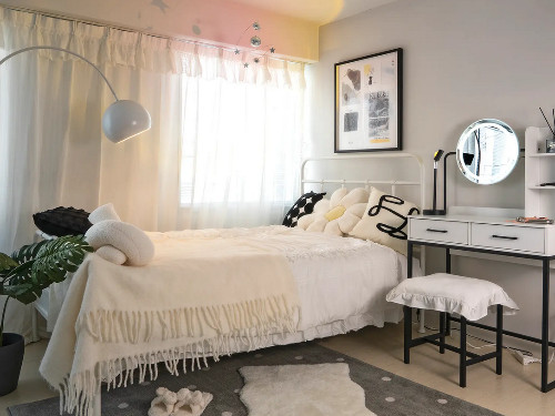 自然光がたっぷり差し込むエレガントなベッドルームは、白を基調とした柔らかな空気感が魅力で、可愛らしさと上品さを兼ね備えた写真表現が可能です。ふわふわの毛布や枕などの小物も揃っており、日常系からファンタジー系まで幅広い作品に対応可能です。