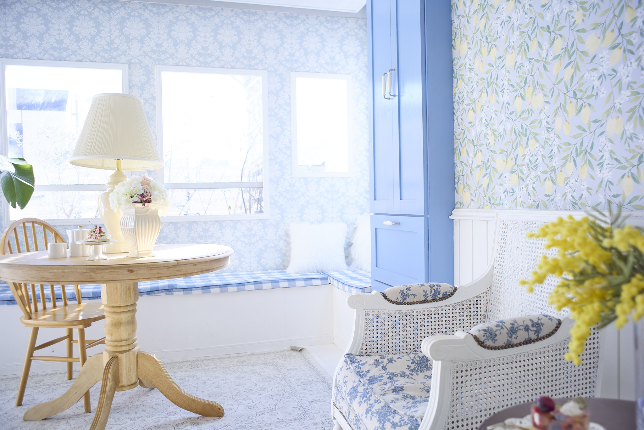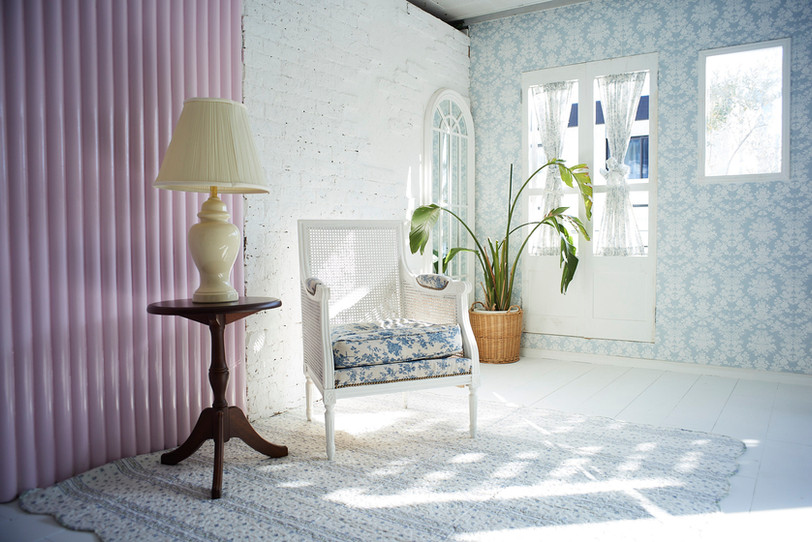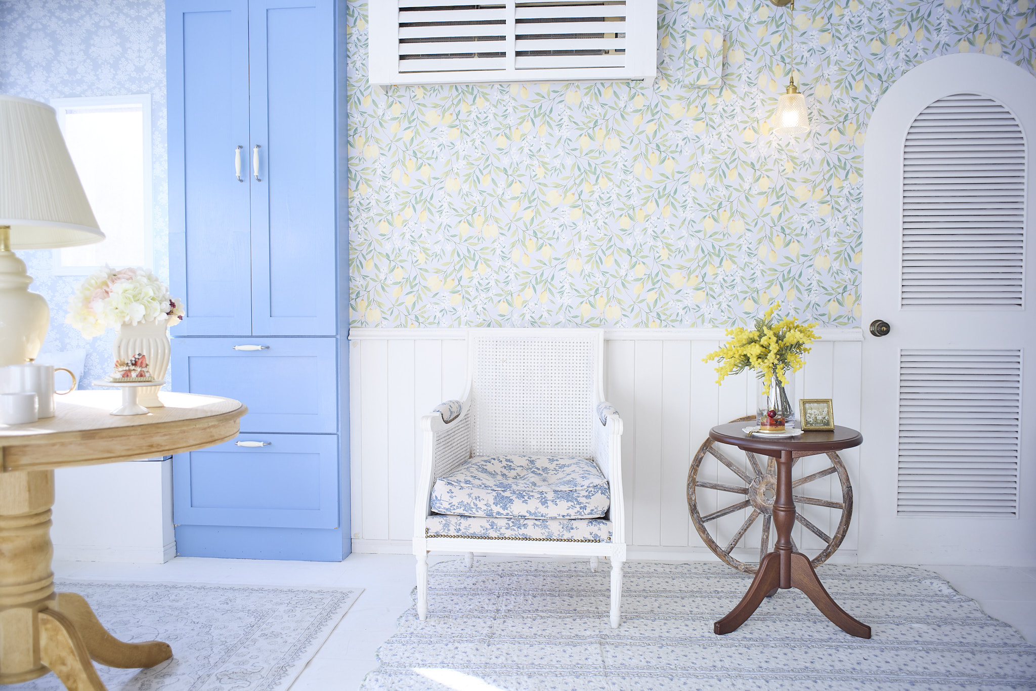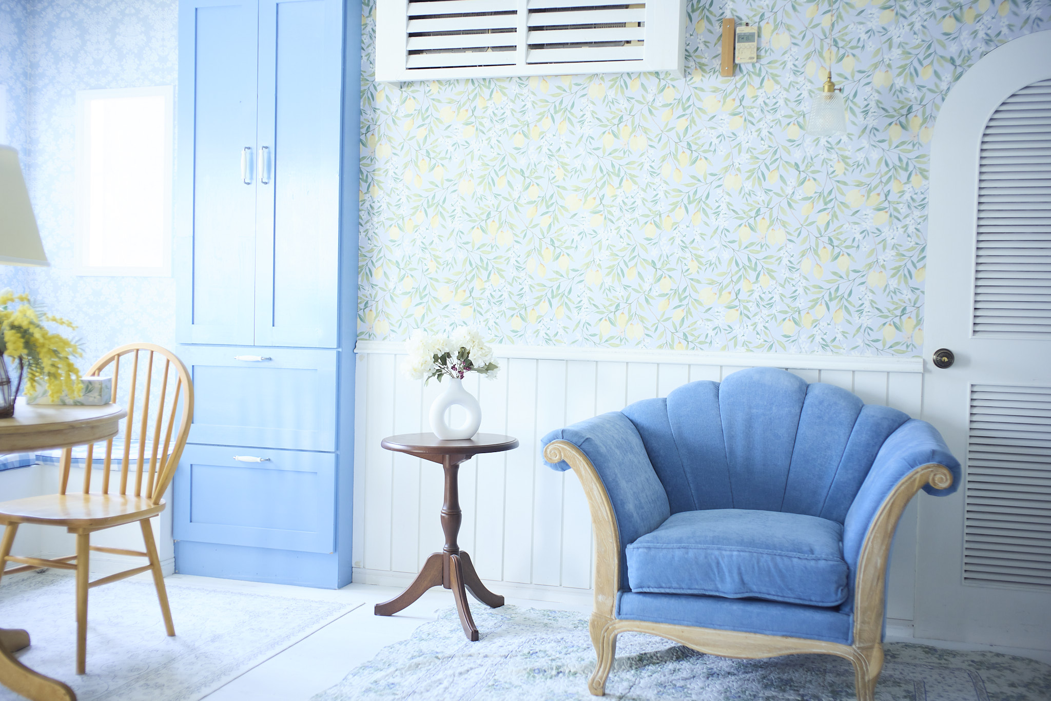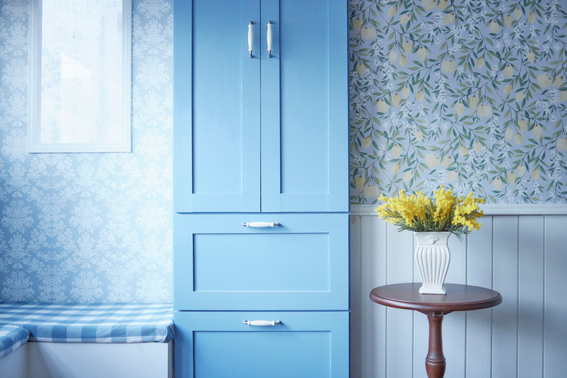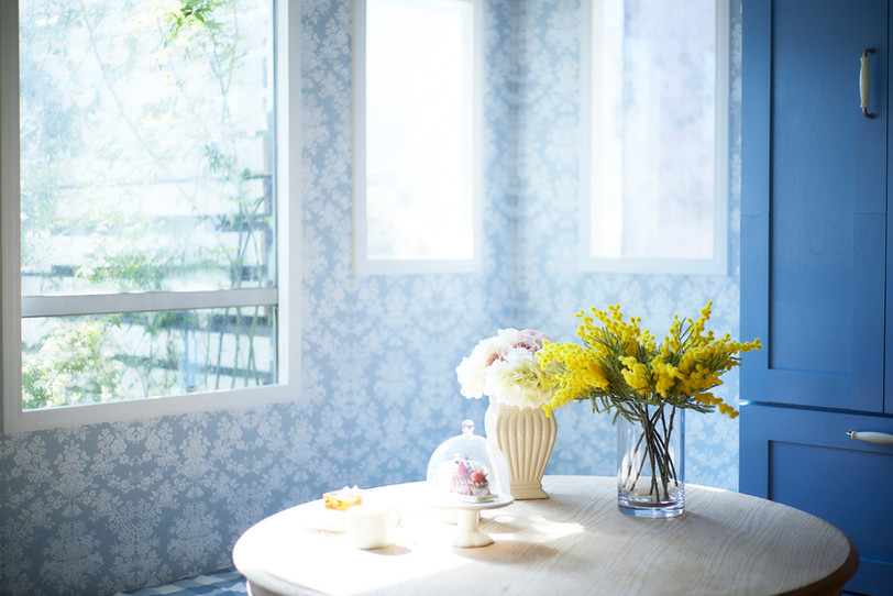 4Fは青を基調とし、柄の壁紙とフレンチテイストな家具で色味鮮やかな空間となっております。