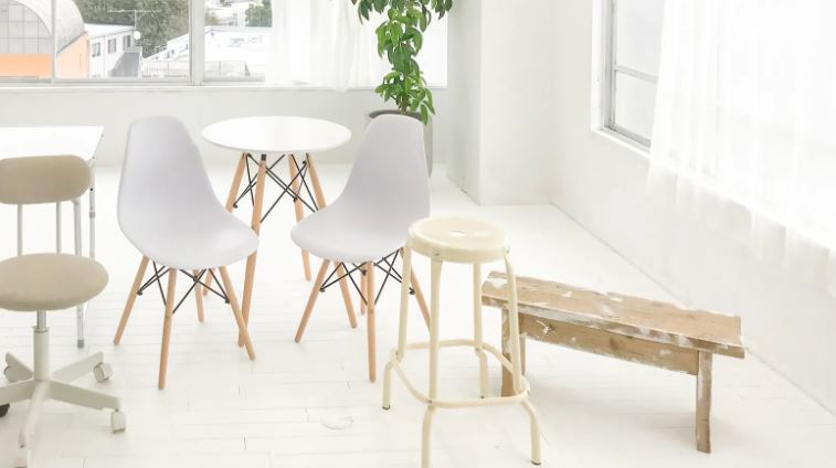 左手側の手塗りの白壁も背景として独特のアクセントを出してくれます。家具を移動させるとスッキリした空間を活かした撮影が可能です。