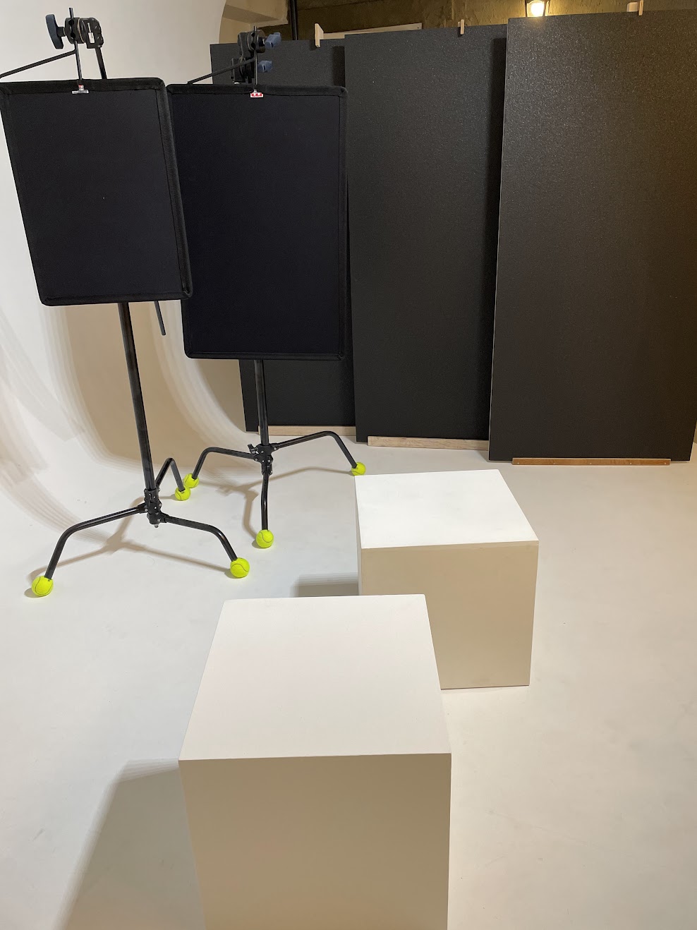 ソフトボックス、カポック、Cスタンド、サイコロ、背景布(白、黒、グリーン)、機材ワゴン