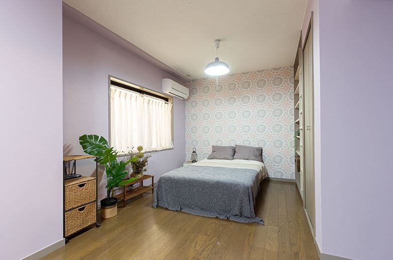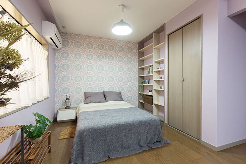 ベッドルームです。パターンの柄壁面に家具も一式揃っています。