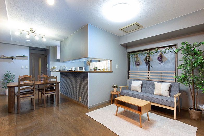 モルタル調の壁面にレンガのアクセントが効いたリビングスペースはナチュラルでモダンな雰囲気を演出できます。
