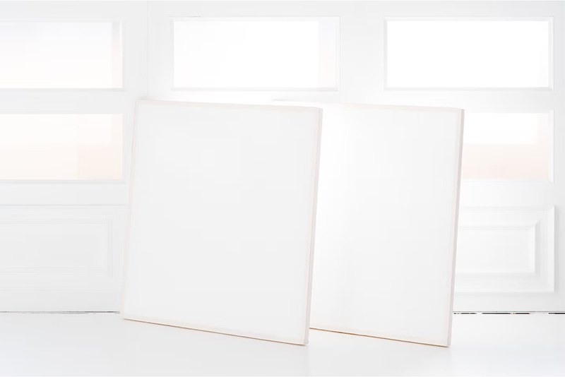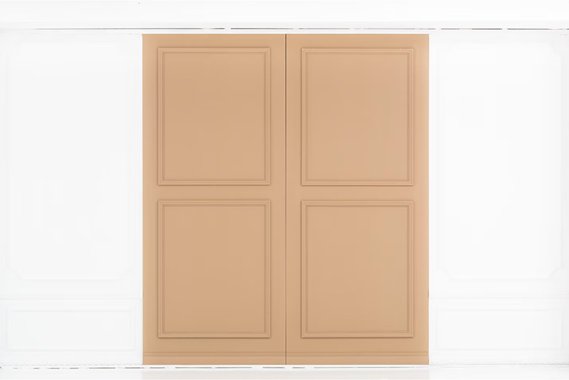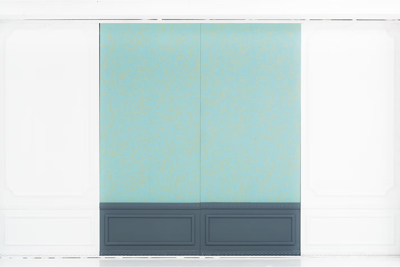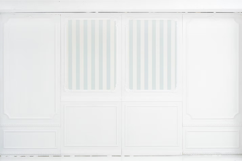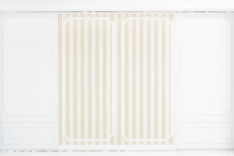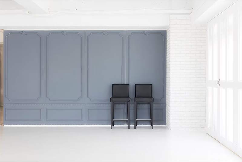 白いエリアと木目のエリアは、入れ替えできる壁で仕切る事ができます。モールディングで装飾されたシンプルでオシャレな白壁です。裏面と入れ替えれば雰囲気の違う背景に変更できます