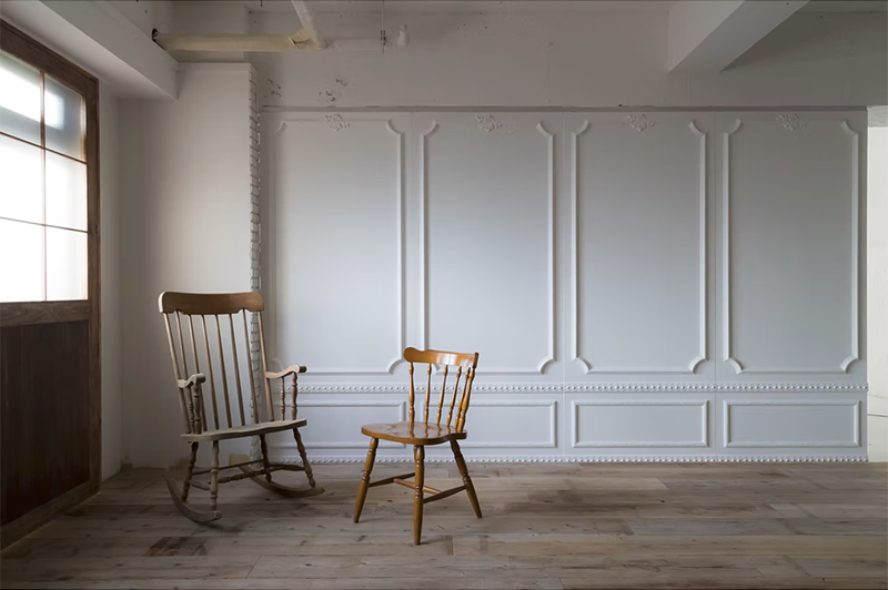 入れ替えできる壁(木目エリア側から見た白面) 木目のエリアと白いエリアは、入れ替えできる壁で仕切る事ができます。モールディングで装飾されたシンプルでオシャレな白壁です