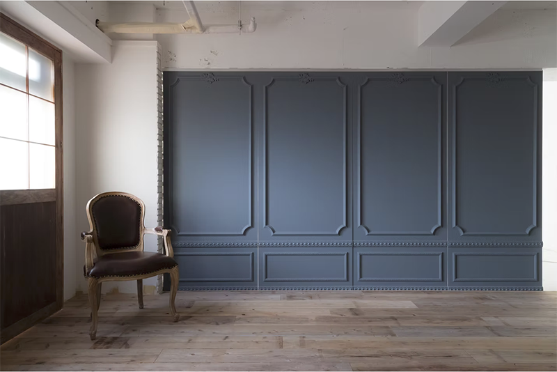 入れ替えできる壁(木目エリア側から見たグレー面) 木目のエリアと白いエリアは、入れ替えできる壁で仕切る事ができます。モールディングで装飾されたシンプルでオシャレなグレーの壁です