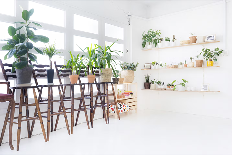 豊富な観葉植物と棚 窓際には豊富な観葉植物に加え、シンプルな棚を新たに設置
