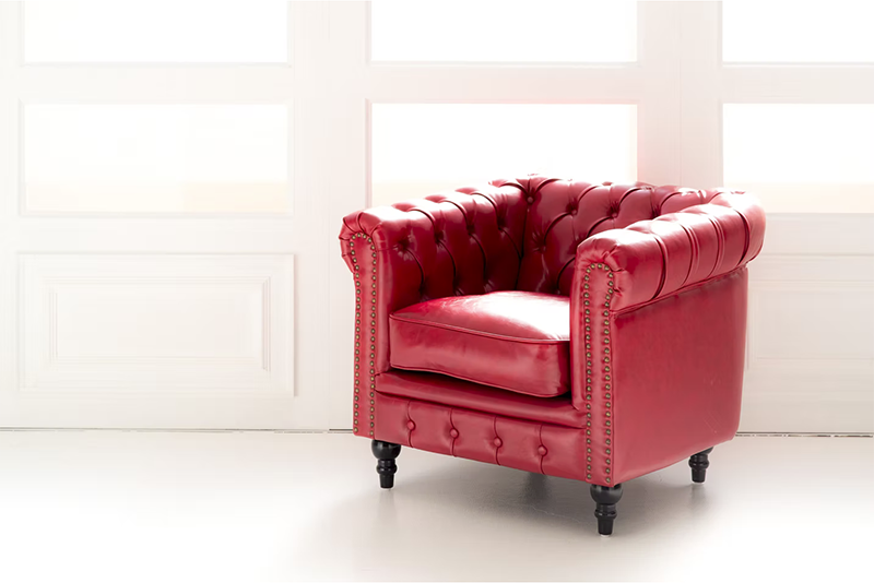 光沢感のある赤が目を引くレザーソファです。 写真にインパクトを与えられます。