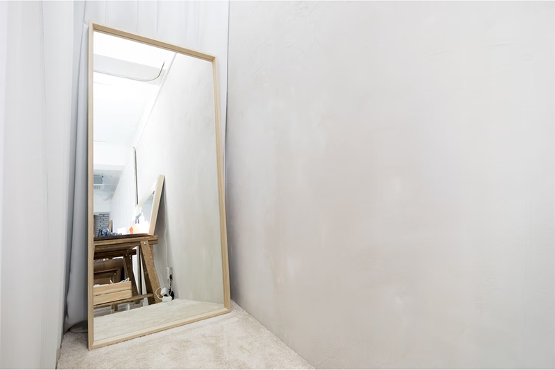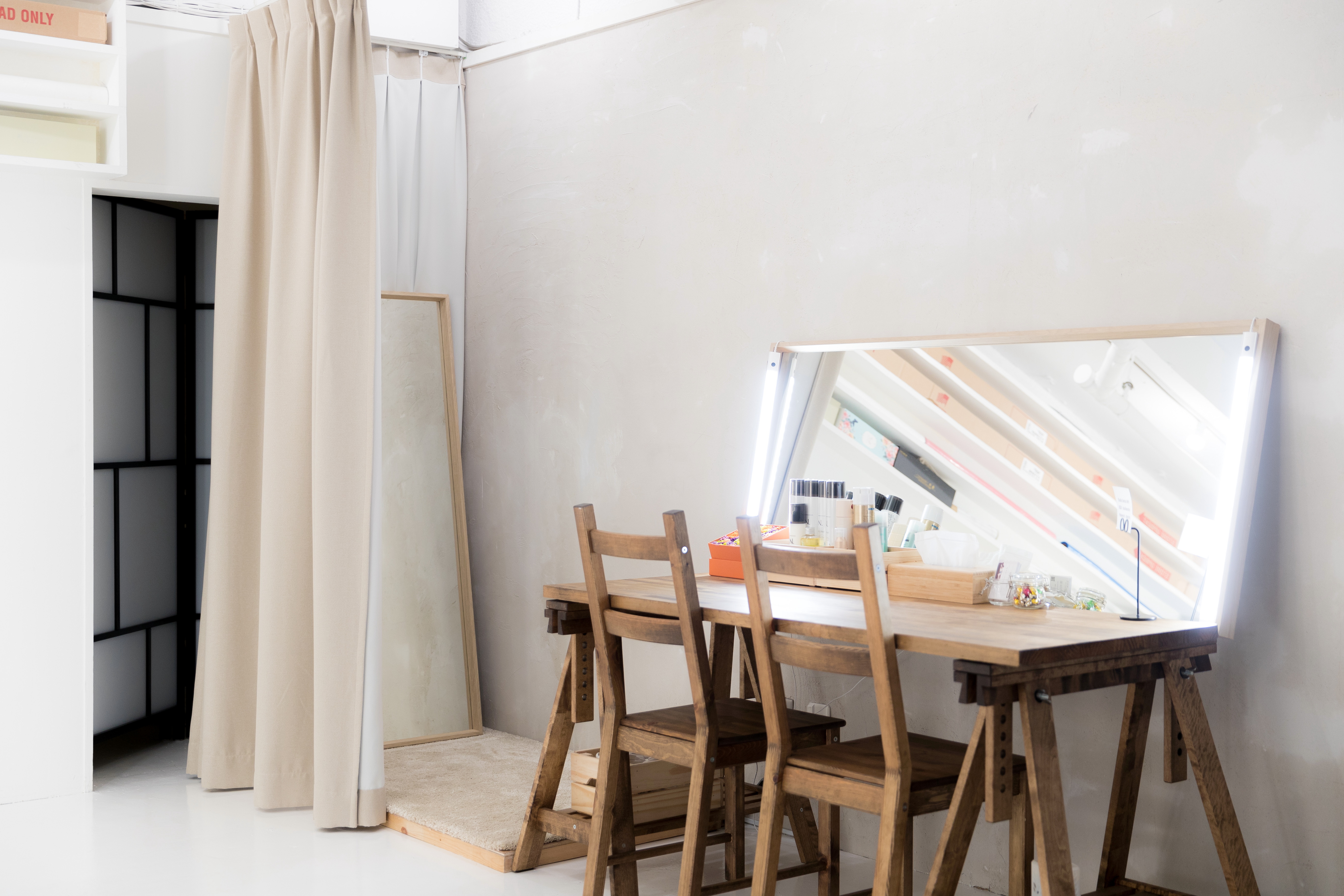 150cmの大型ミラーを用意した十分な広さのヘアメイクスペースと更衣スペースです。 机は移動できるようにしてありますので、お好きな場所にセッティングできます。