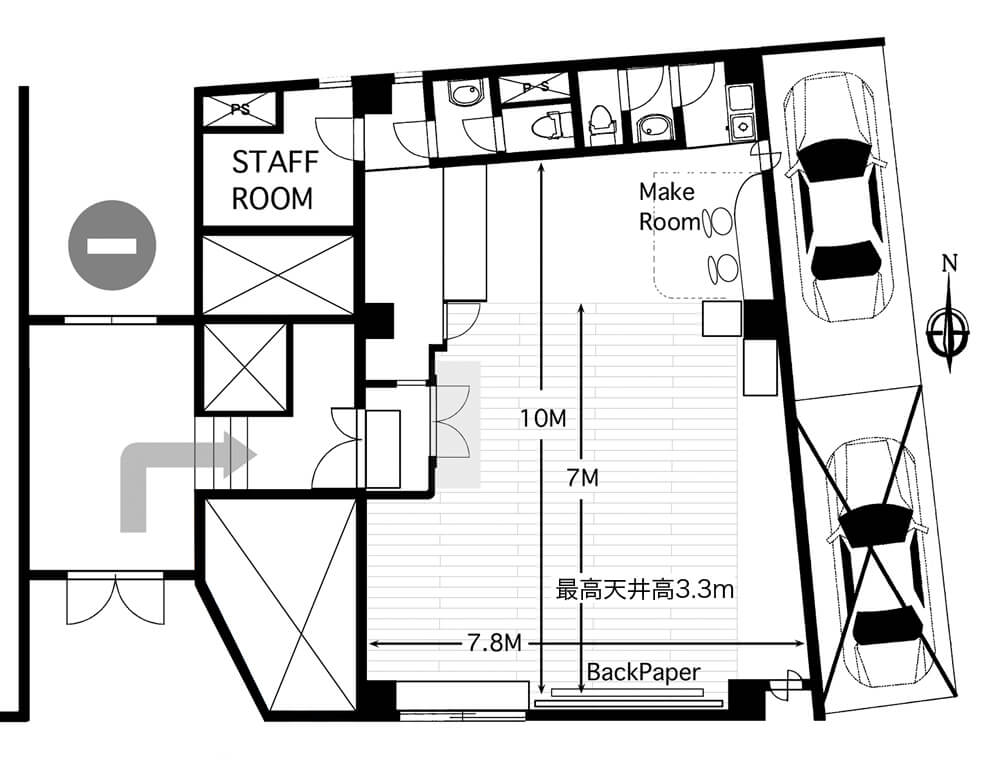 スタジオ内にはメイクルーム、化粧室も完備。また、駐車場も1台までOKなので、荷物の多い方には耳寄りな情報ですね♪