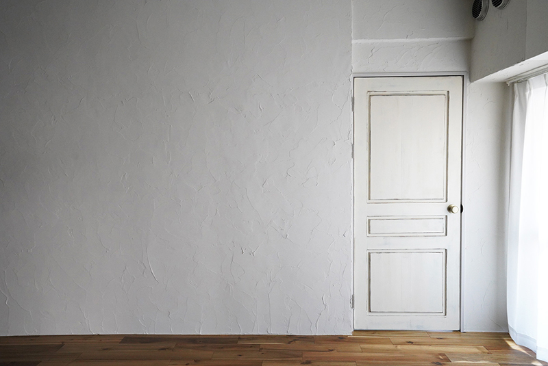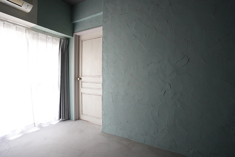 漆喰のミントグリーン壁・グレー壁・ウッド壁エリアは異なる3つの背景を有するエリアです。