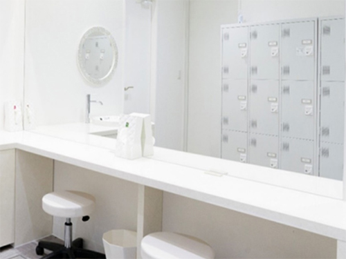 鍵付ロッカーを完備しているパウダールームは、準備がしやすいよう大きなミラーあり。