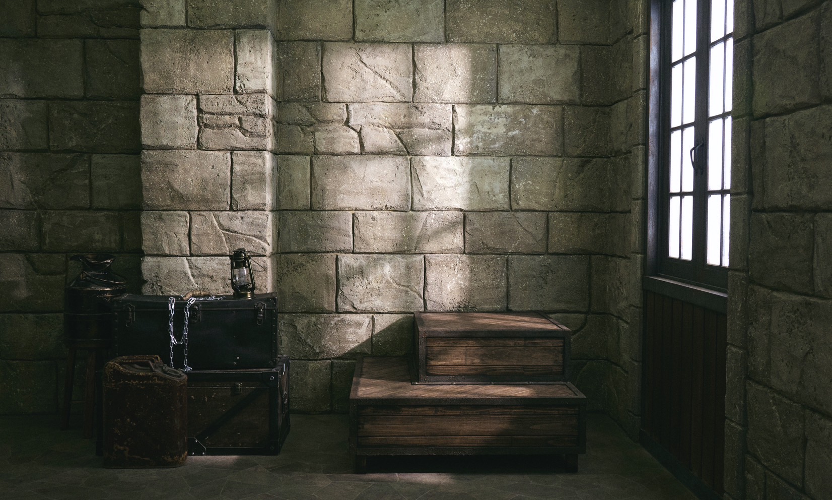 【レンガ壁】 鉄の扉と鉄格子のあるリアルなレンガ壁です。 鉄の扉の小窓からは自然光が少し入ります。(一部時間のみ)