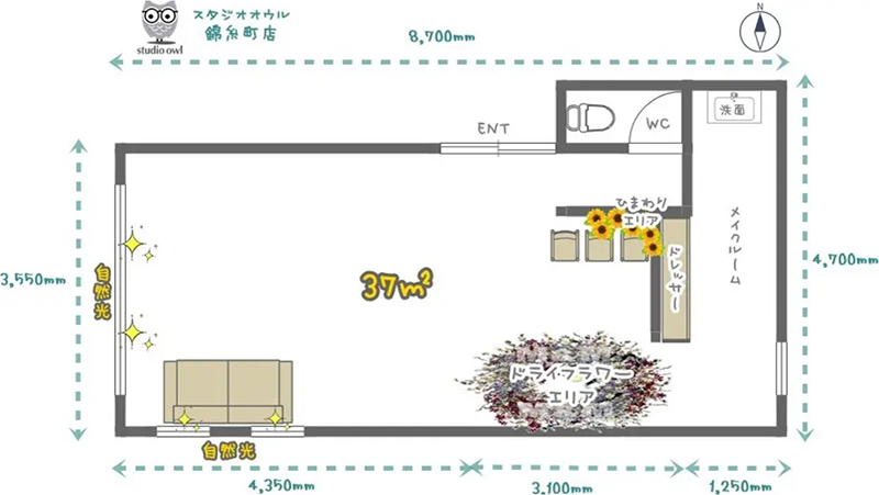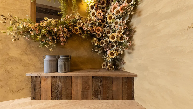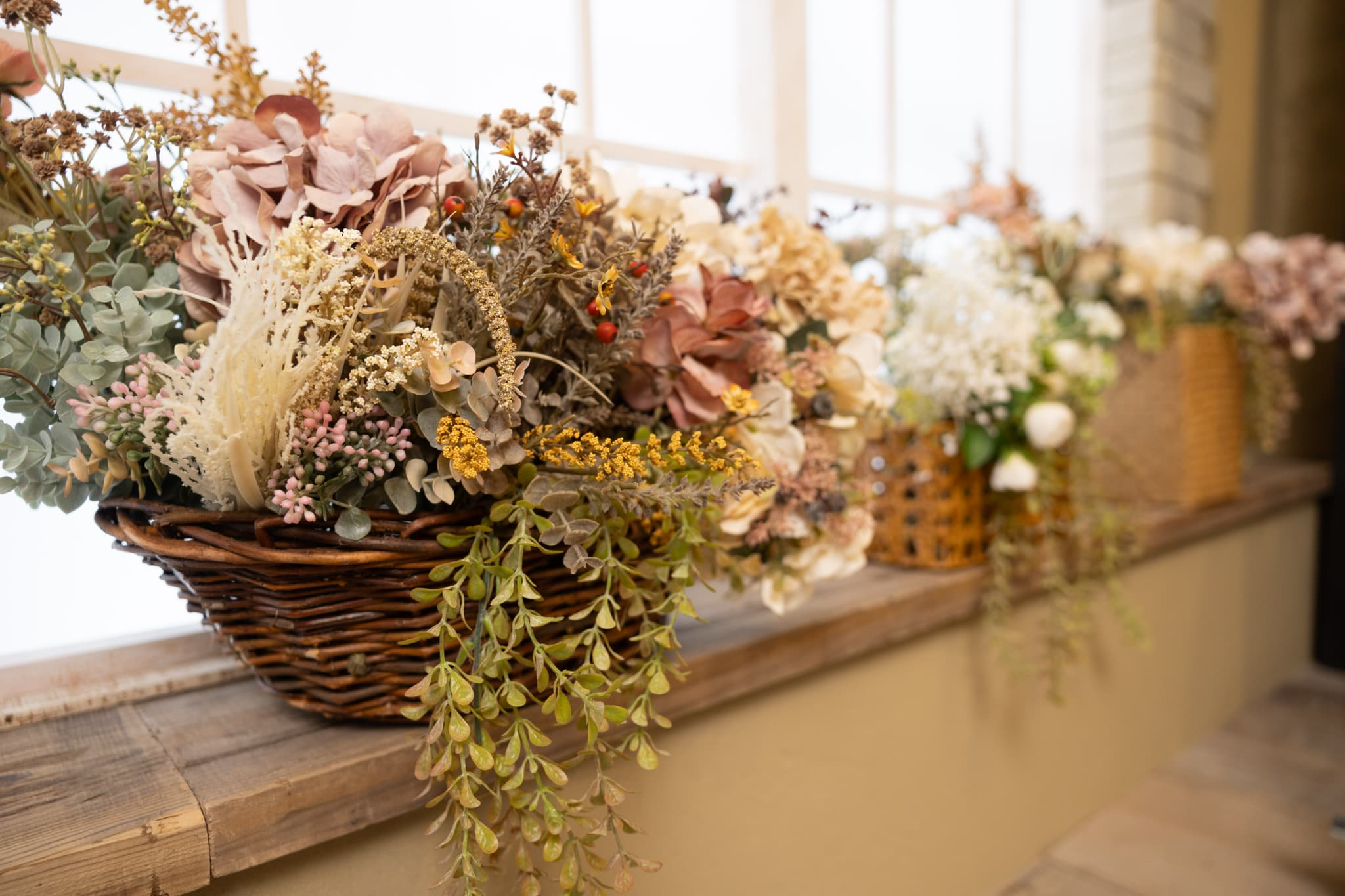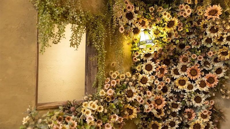 スタジオオウルならではの圧倒的ボリュームのドライフラワー空間は勿論、錦糸町店では独自にひまわりを使用した季節感を演出!