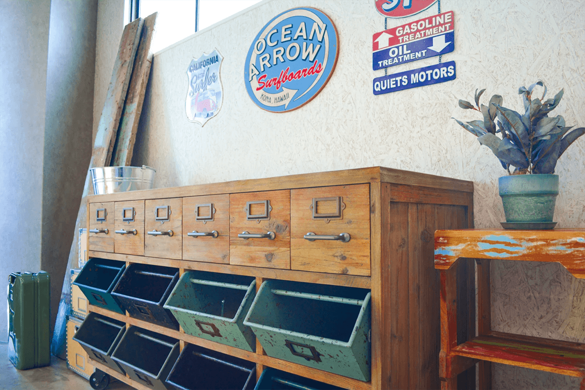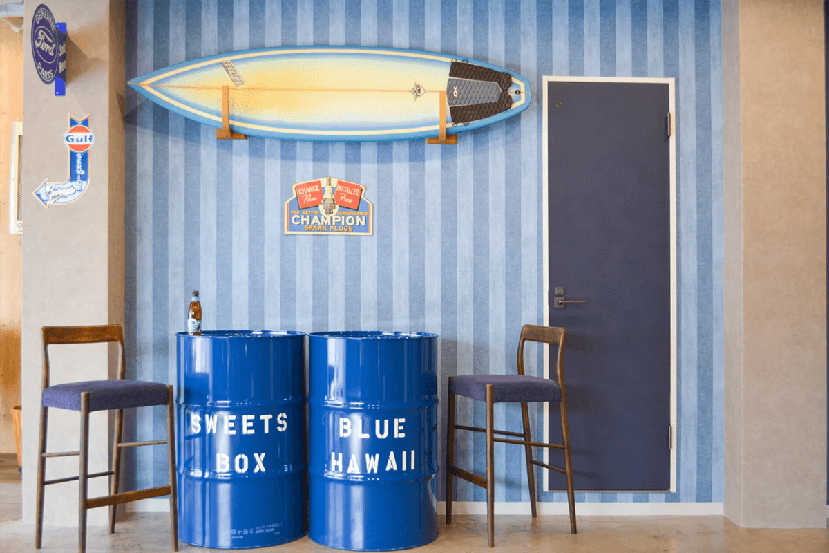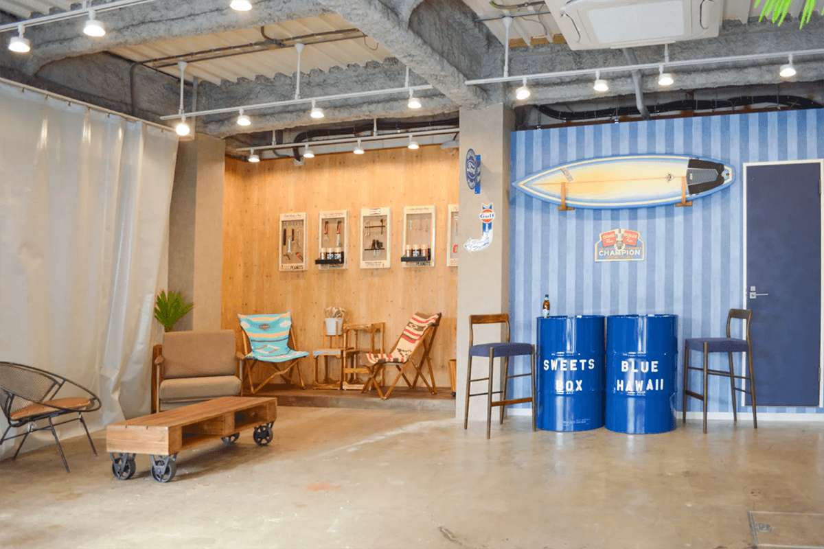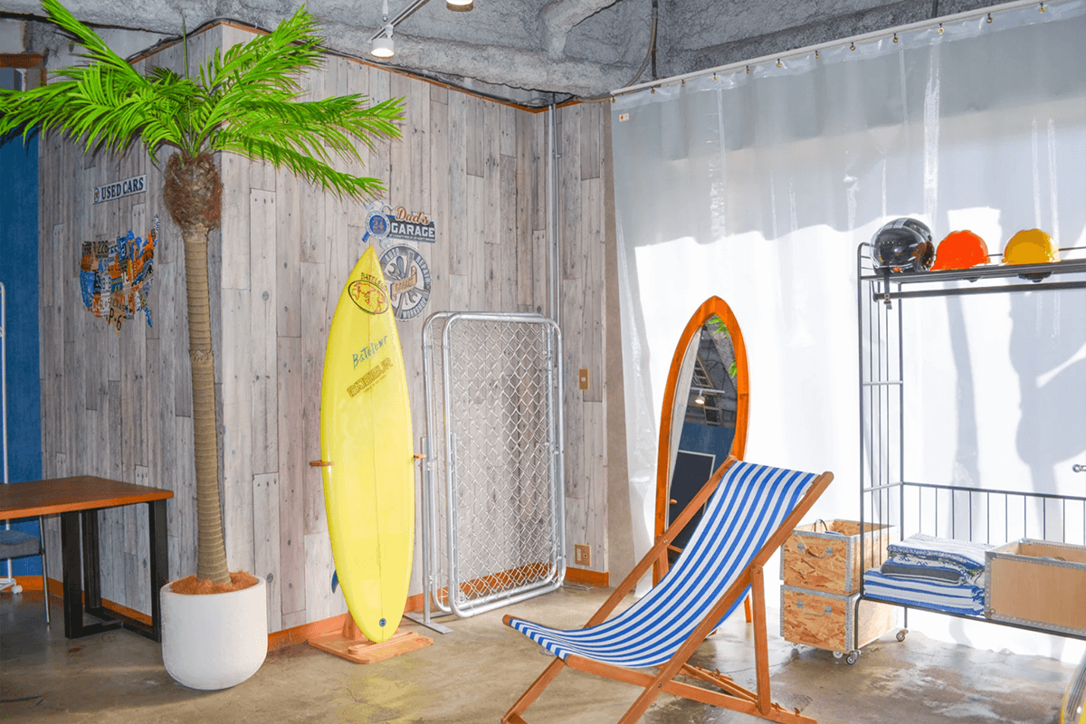 ストライプのブースはチェアやドラム缶・サーフボードなどテイストに合わせた小物も充実!