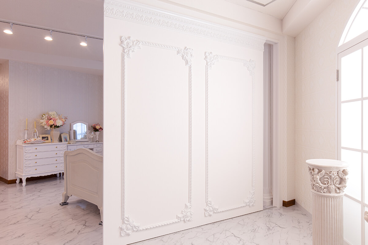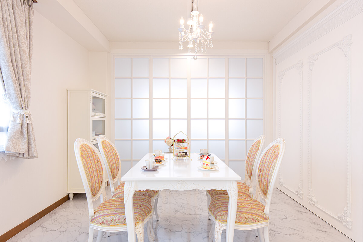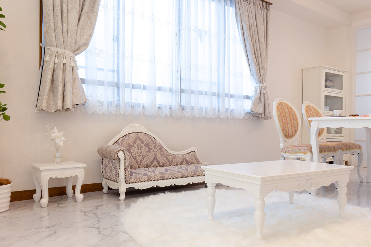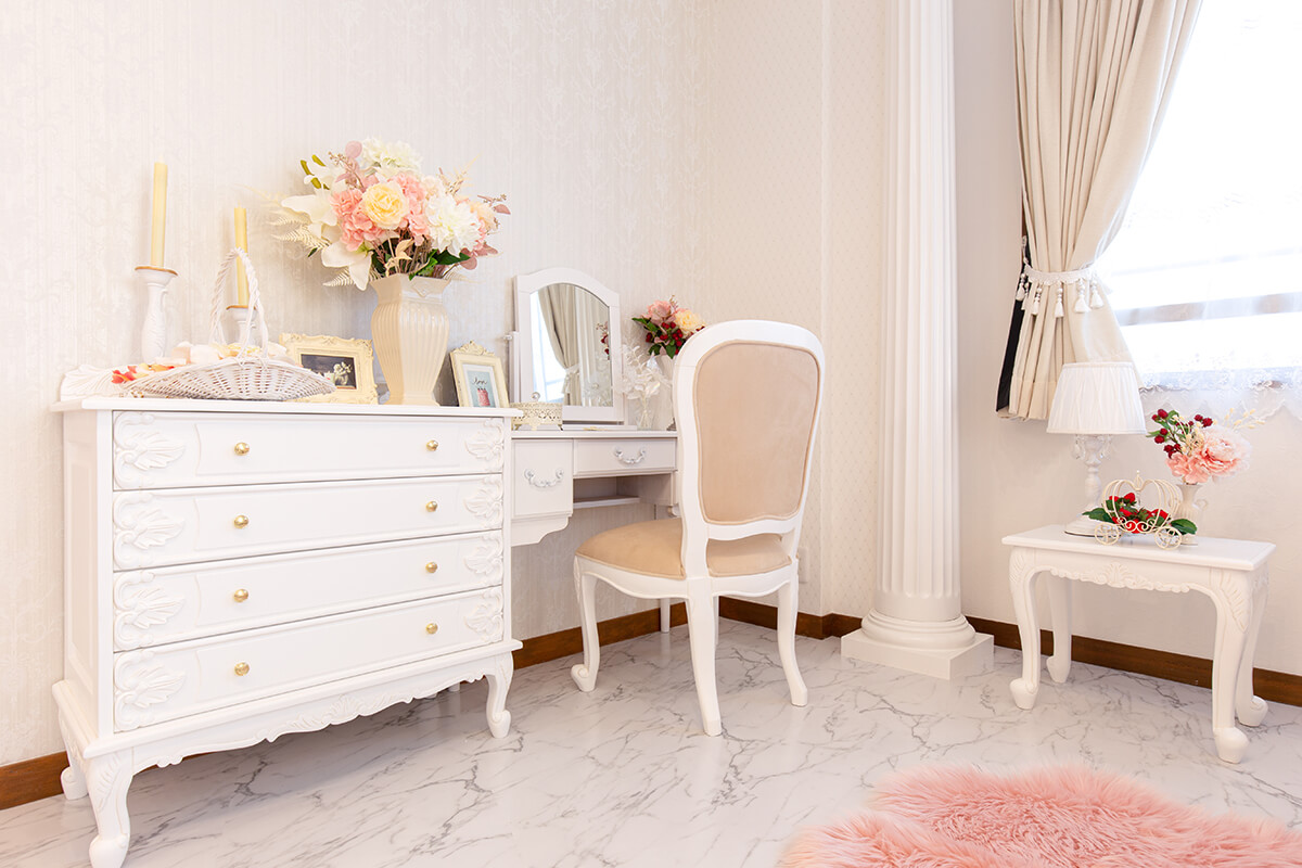 ソファやテーブル・ドレッサーなどの家具やインテリアすべてを白基調のガーリーなアイテムでまとめ、ゴージャス且つ可愛い空間を演出しております。
