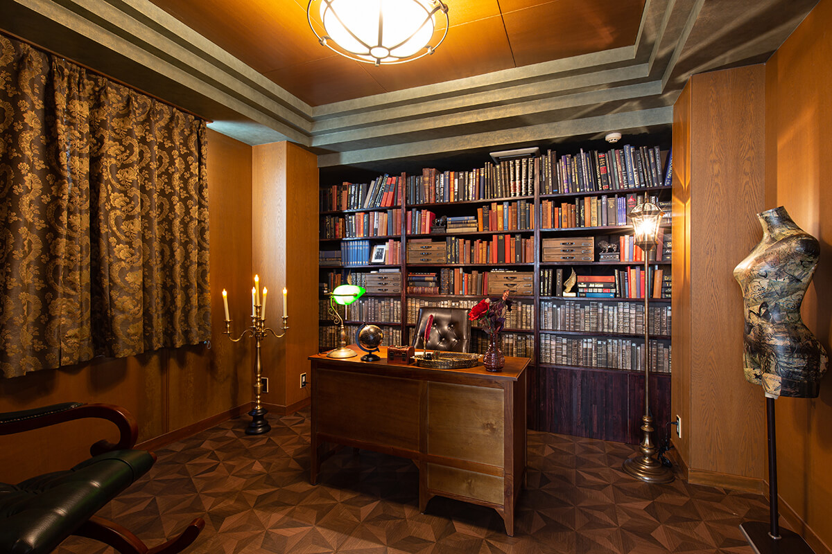 書斎ブースもあり、壁一面の本棚は撮れ高の高い背景となっております。