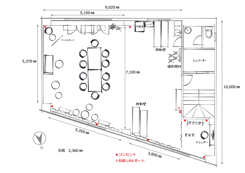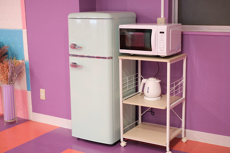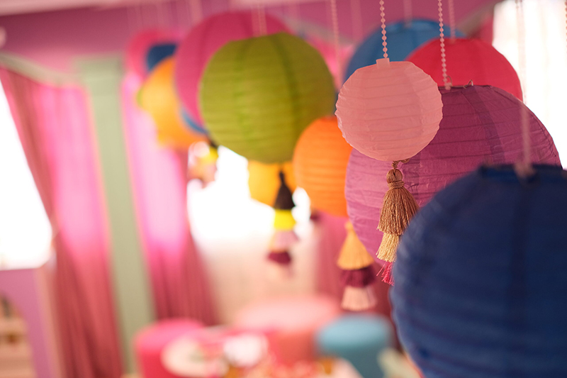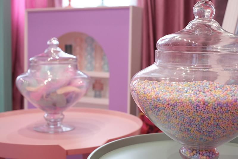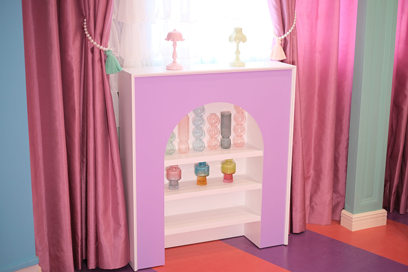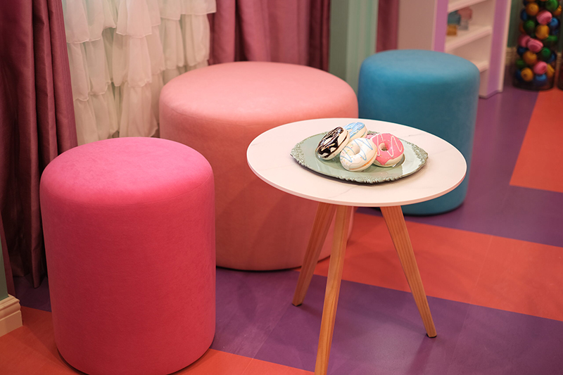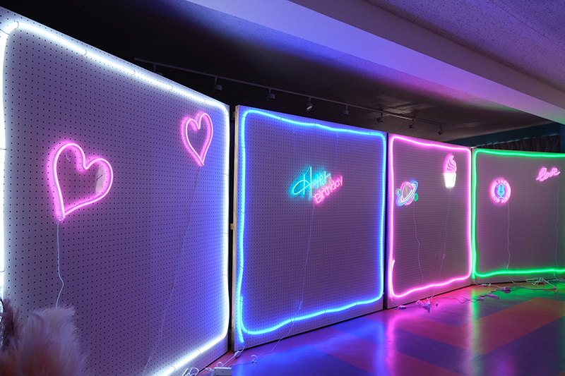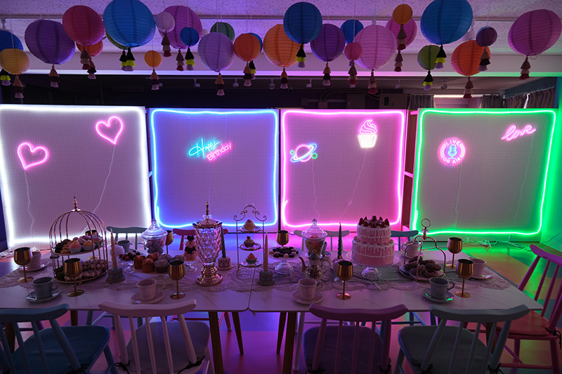 ビビットな配色に加え、天井柄吊られたペーパーランタンやネオン壁面・多数のフェイクスイーツや撮影小物で高クオリティかつオリジナリティの高い撮影空間となっております。