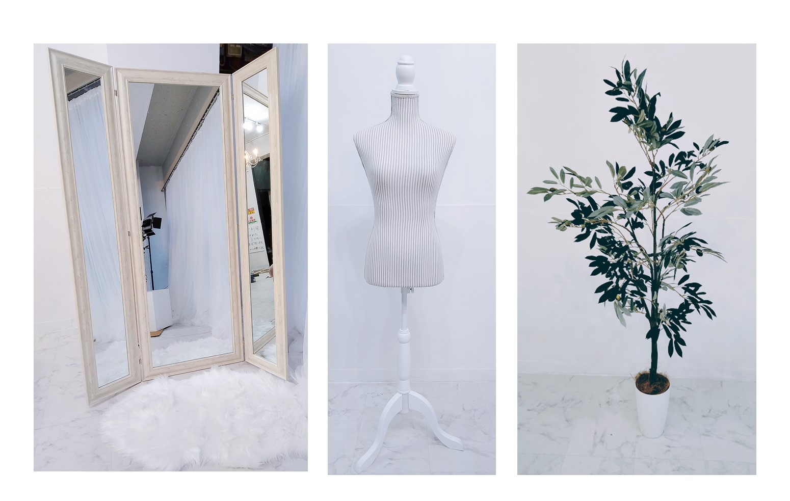 正六面体サイコロ、撮影用ベッド、観葉植物(オリーブの木)、トルソー、造花数種、ブックボックス、その他諸々の無料で使える撮影道具が充実しています!